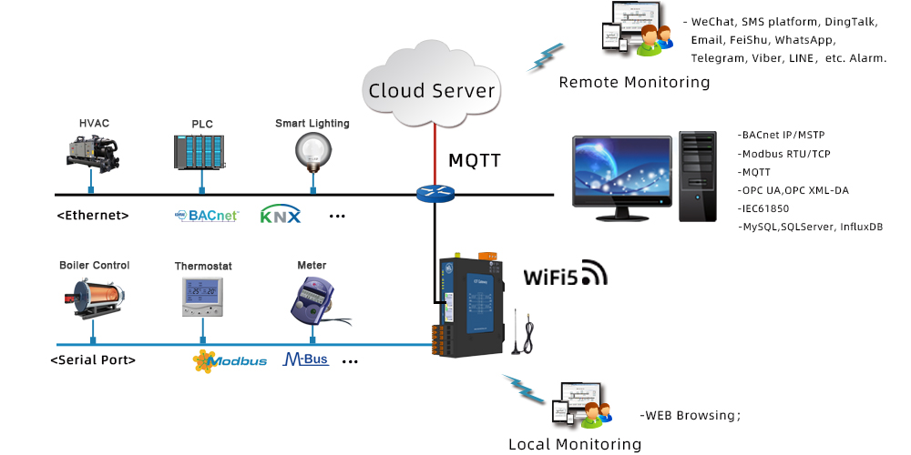The IoT gateway HMI2004-ARM-WiFi (with 2 Ethernet port, 4 RS485 serial port, dynamically supporting 1024 points) supports the collection of Modbus RTU/TCP and more than 500 protocols, simultaneously forwarding it to BACnet IP and Modbus RTU/TCP servers. It also features WeChat Alarm, MQTT server , and the ability to upload projects to the cloud.