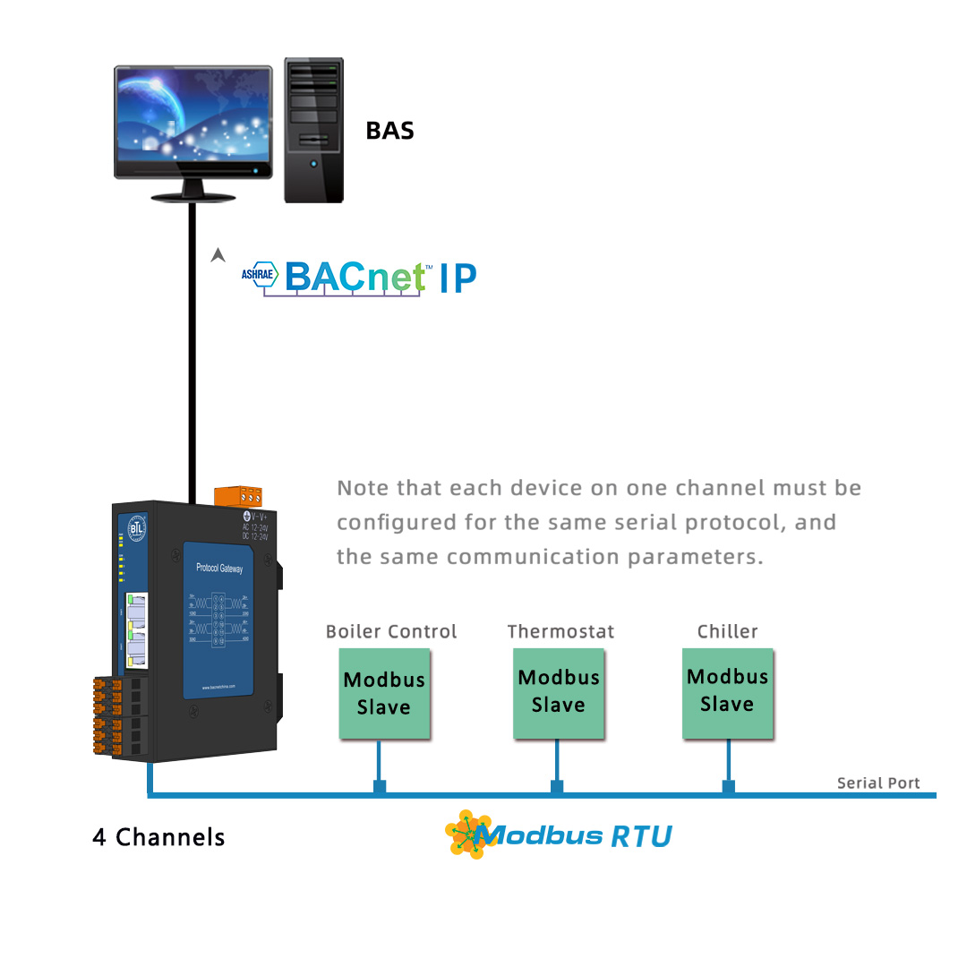 BACnet Gateway, BAC2004-A9 (featuring 2 Ethernet port and 4 RS485 serial ports, dynamically supporting 2048 points), is capable of collecting data from Modbus RTU and more than 500 protocols, and forwarding it to BACnet IP, BACnet MS/TP server, and OPC UA server.