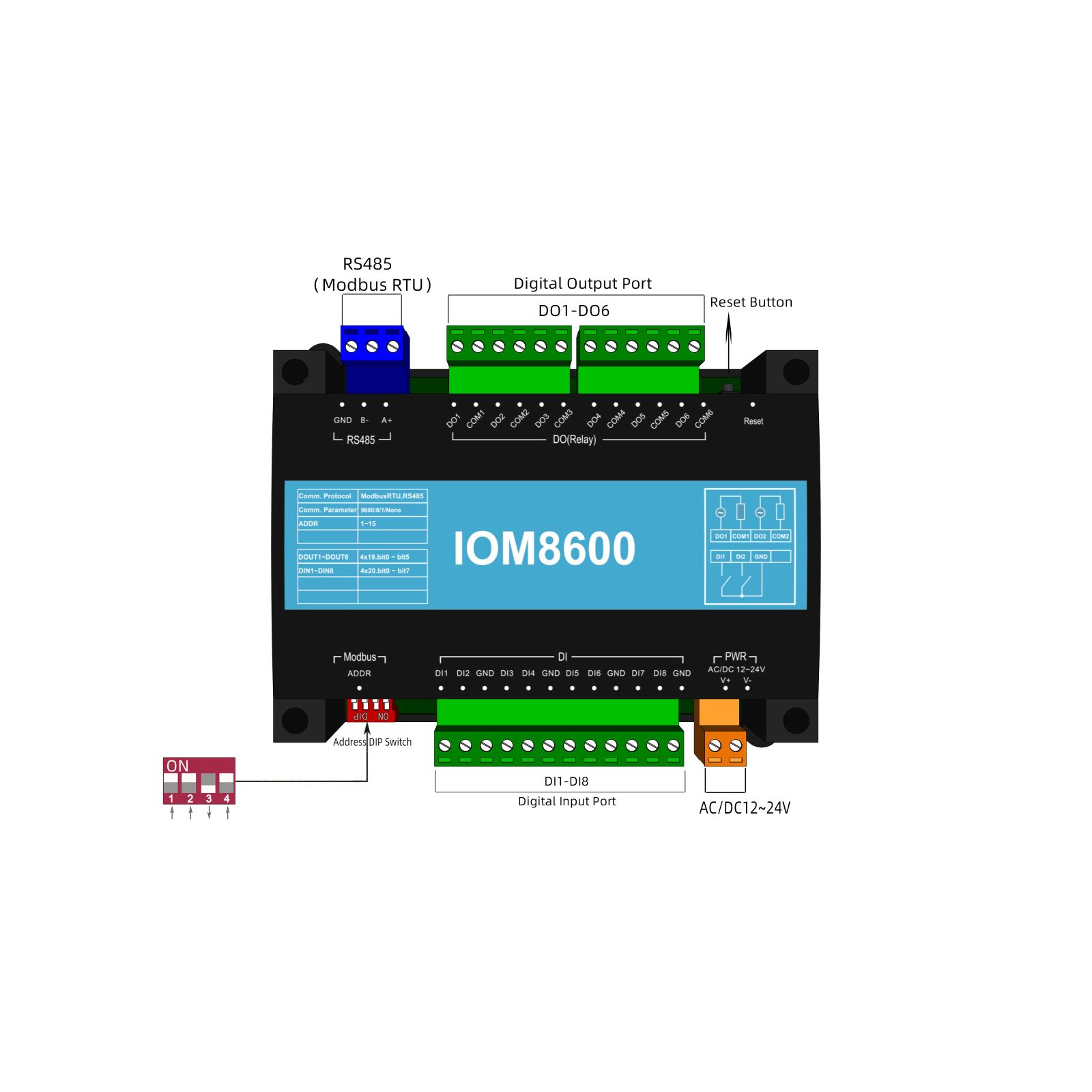 Q④: How to forcibly reset the baud rate of this I/O module to its default value? A④ : Activate the module's hardware reset button (typically labeled Reset). This action immediately restores the baud rate to 9600, ensuring rapid reset of the communication link to its initial state.