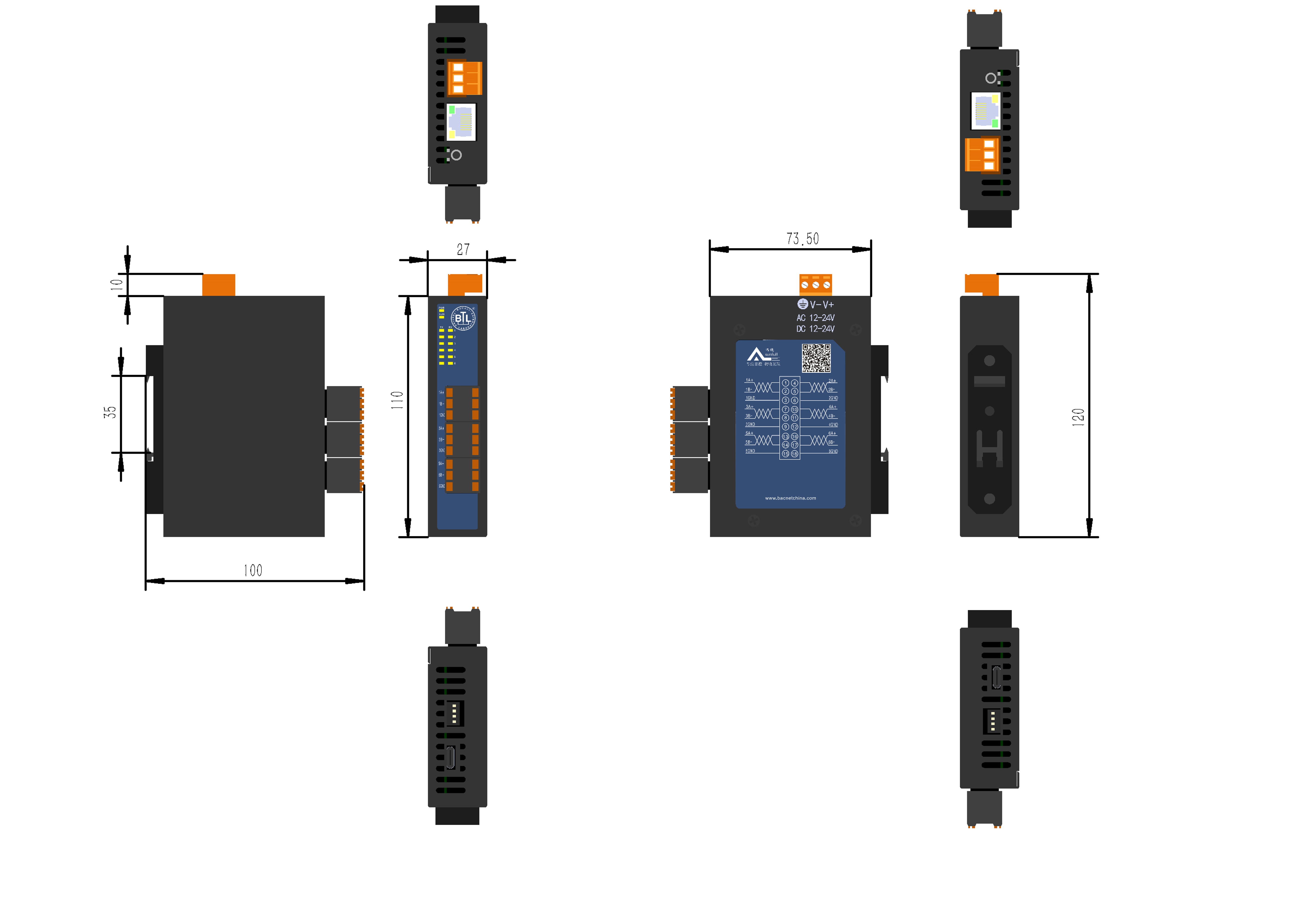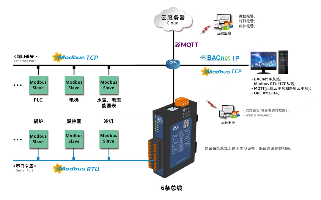 物联网关HMI1006-Lite-E (1个网口,6个RS485串口,动态支持1536点)支持采集Modbus RTU /TCP、Simulator同时转发为BACnet IP、Modbus RTU/TCP服务器。同时具有微信报警、钉钉报警、邮件报警,MQTT服务(支持迅饶云平台和新奥云平台)、工程上传云端等功能。网关使用X2View软件做配置 (不带组态功能)。用户可根据现设备的点表进行配置,转成标准BACnet IP、Modbus RTU/TCP,上传到硬件网关中,BACnet/Modbus客户端就可以通过网关访问现场设备的数据。  注意:网关采集端Modbus寄存器10进制地址是从1(Base1)开始,16进制地址从0(Base0)开始;转发端的Modbus寄存器基地址都是从1(Base1)开始