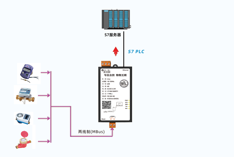 迅饶MBus转西门子S7网关型号为PFN1010-MBus,有1个网口、1个MBus口,可以集成两线制的MBus水表、能量表、热量表或者Modbus协议的各种设备。